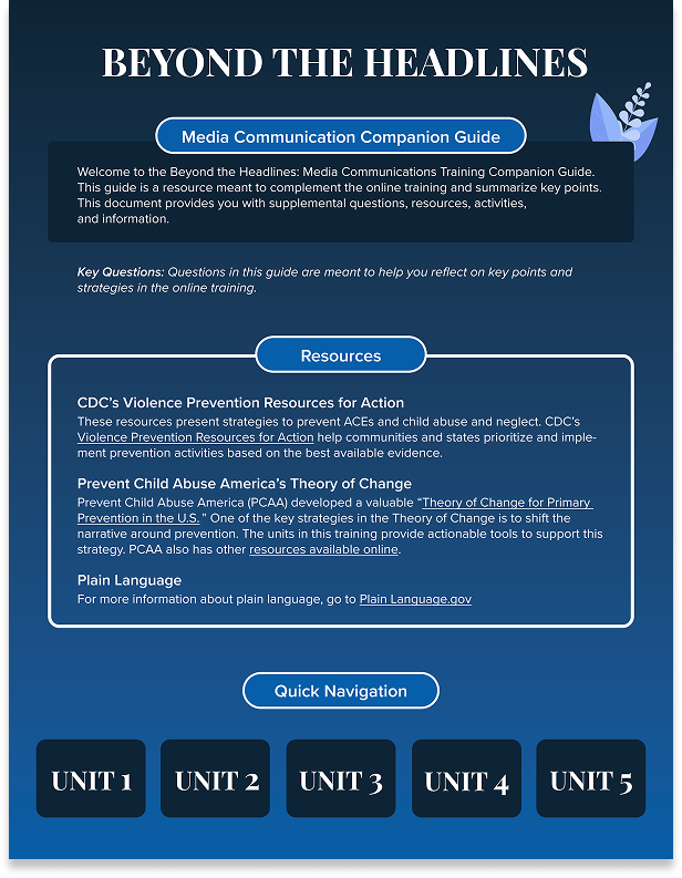 Welcome to the online course, "Beyond the Headlines: Media Communication Training." This training is for adverse childhood experiences (ACEs)- and child abuse and neglect (CAN)-focused public health professionals who communicate with the media about ACEs and CAN. The training teaches communications basics, effective messaging, media pitches, and interview management techniques. Click the "Next" button to get started!
